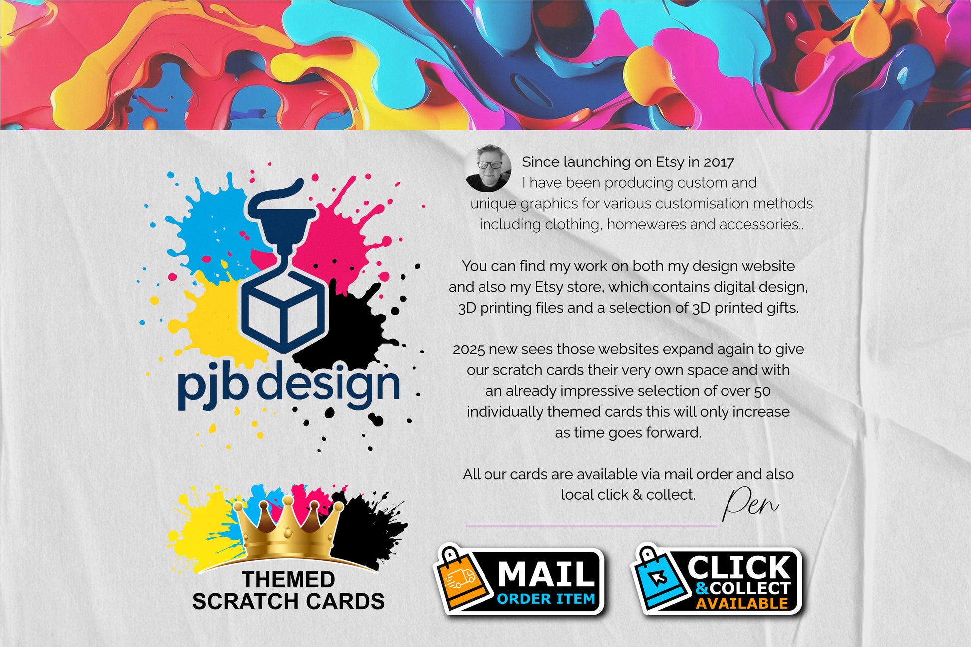 The size of this card is A3 and is available to posted folded to reduce postage costs. The card has been designed so that once folded it doesn't cease any of the play area or the scratch strip.