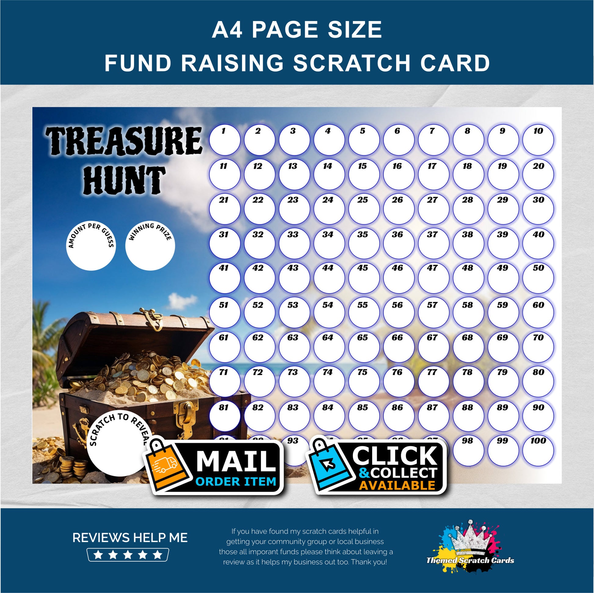 A4 Pirate Treasure Chest Themed Lucky Number Fundraising Scratch Card - Local & Community Fund Raising